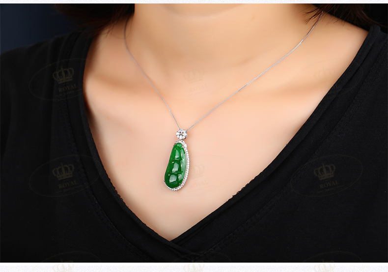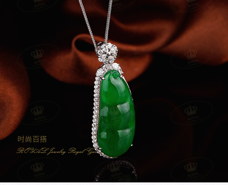 天然A货翡翠吊坠,老坑冰种满绿,豆荚寓意丰收、多子多福、耕耘收获,三颗寓福禄寿齐到,连中三元。这颗豆子吊坠形体柔润饱满,荧光闪闪,翠色欲滴。