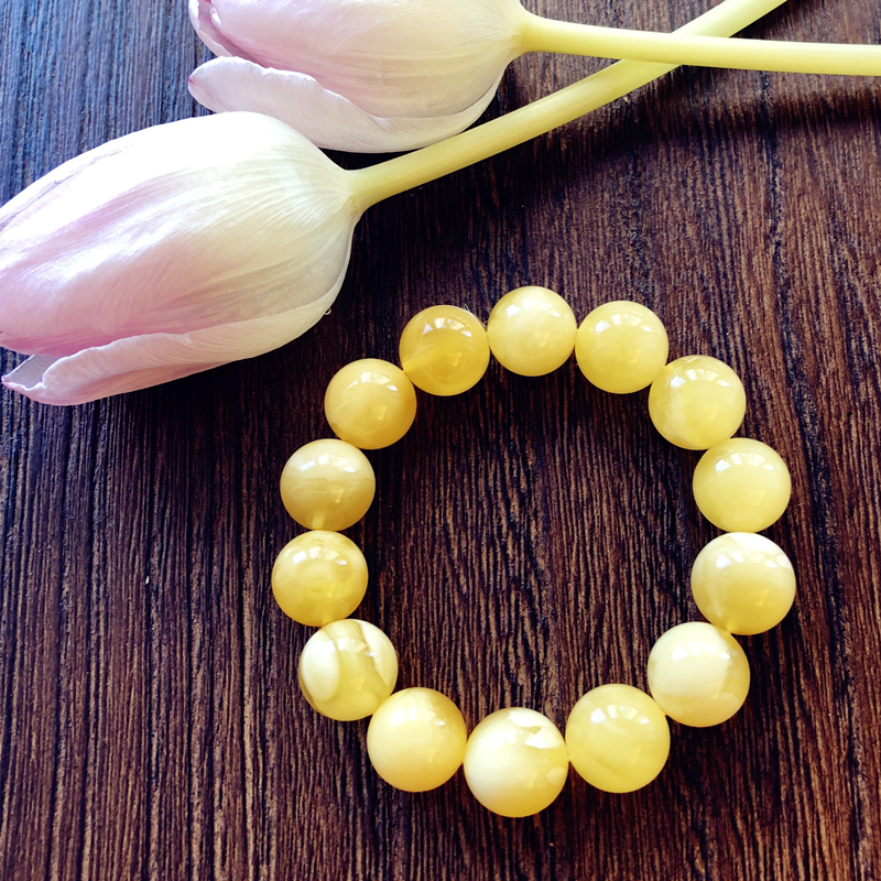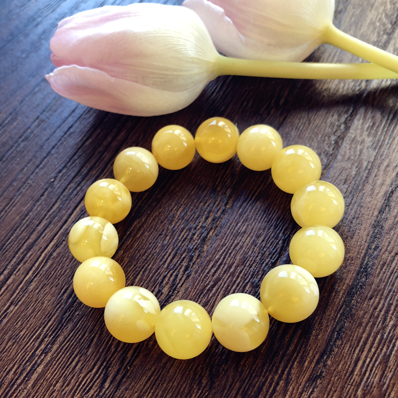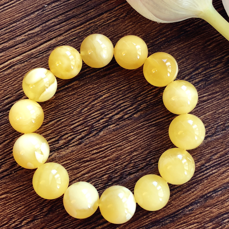 俄料白花蜜蜡手串,满蜜白花蜡鸡油黄,蜜蜡蜡质好,滚白花,13MM直径,特别美