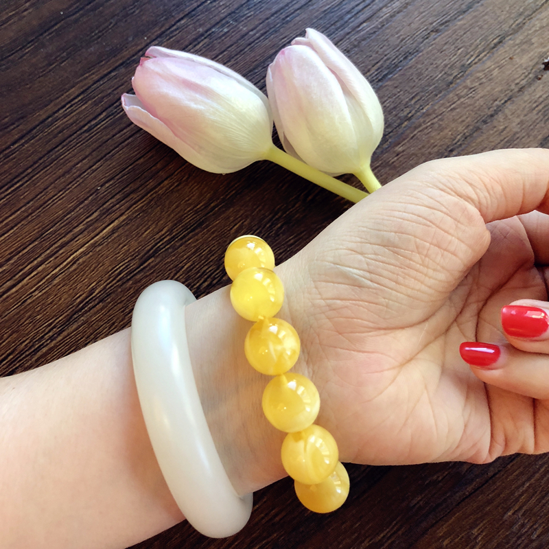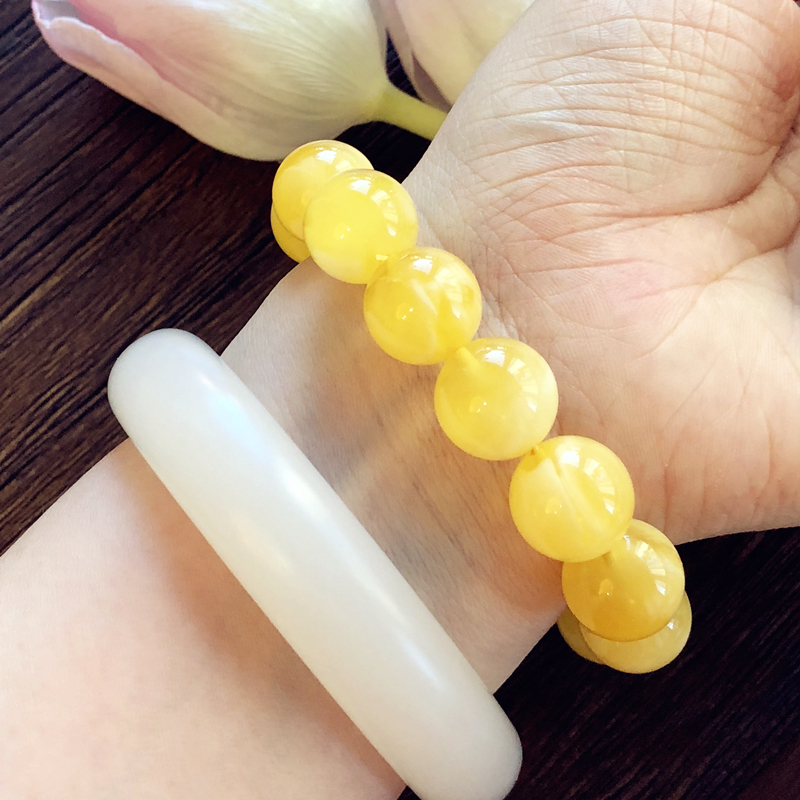 俄料白花蜜蜡手串,满蜜白花蜡鸡油黄,蜜蜡蜡质好,滚白花,13MM直径,特别美,无需任何修饰,夕阳下山时拍,还能这么美腻,手圈不够可以多加一颗珠子[呲牙][呲牙]喜欢快来拍吧[愉快]