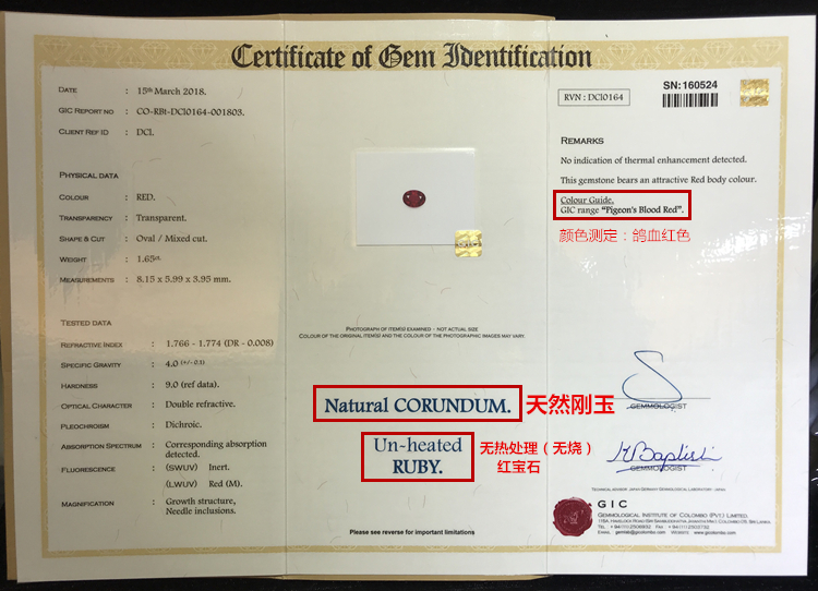 红宝石1.65克拉天然无烧鸽血红色