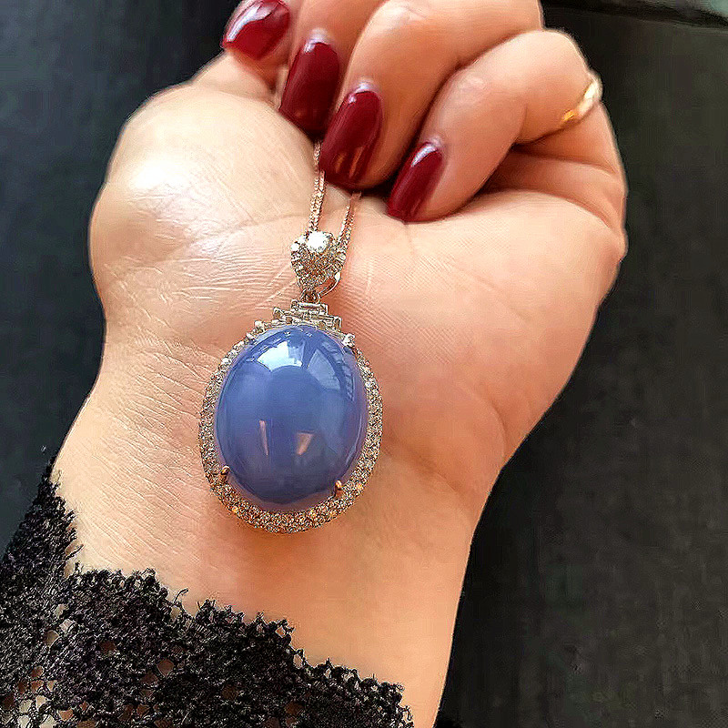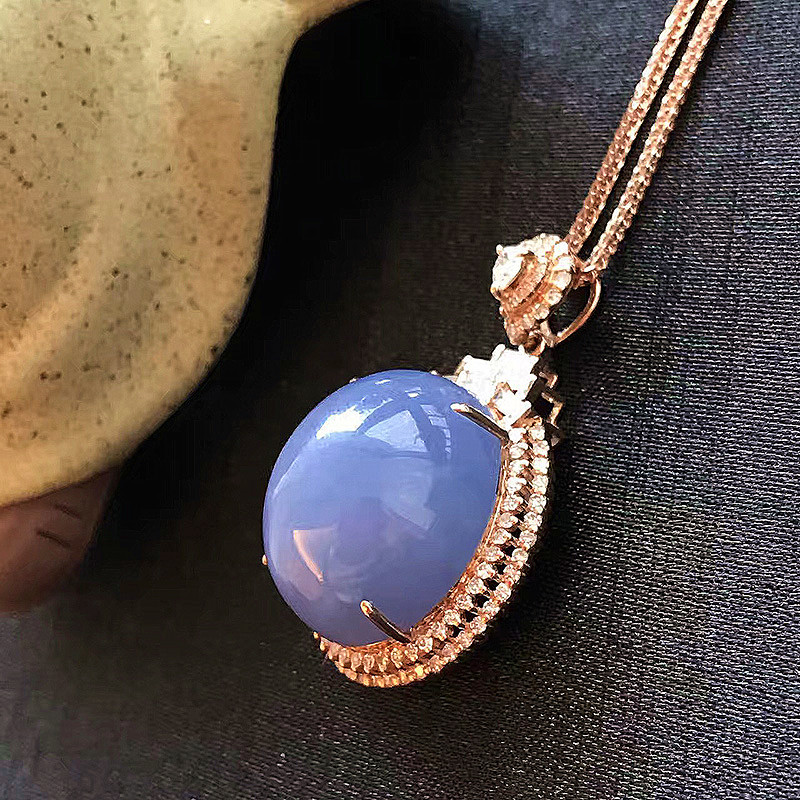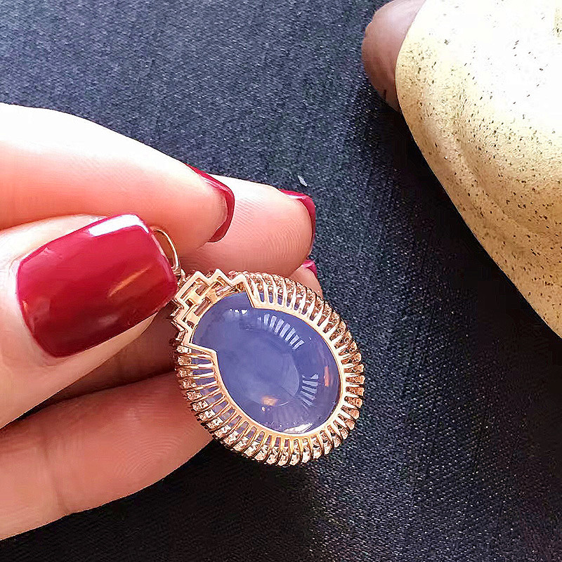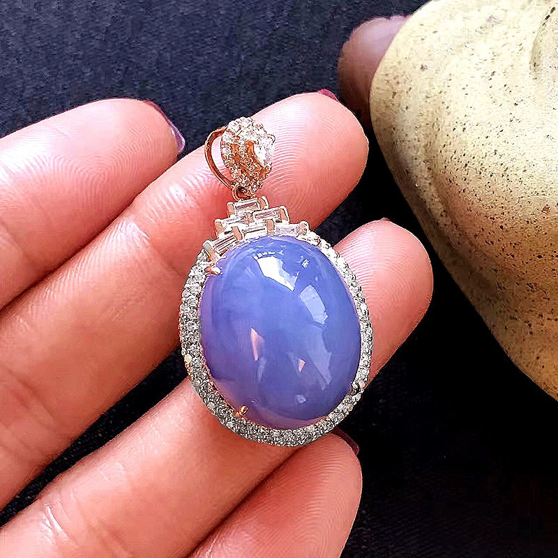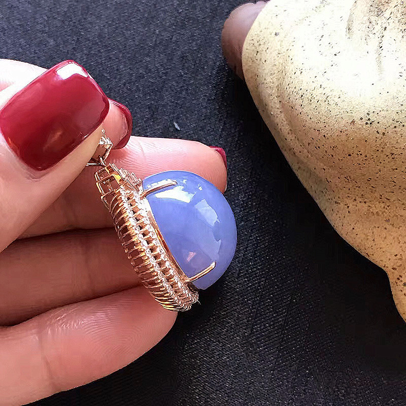紫罗兰翡翠项链,非常非常饱满的一颗大蛋面,一看就甚是喜欢,颜色匀,异常浓郁,18K玫瑰金钻石镶嵌。