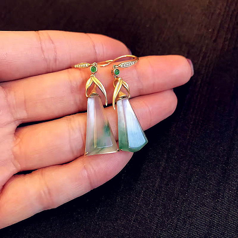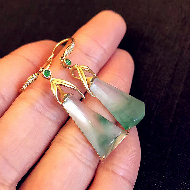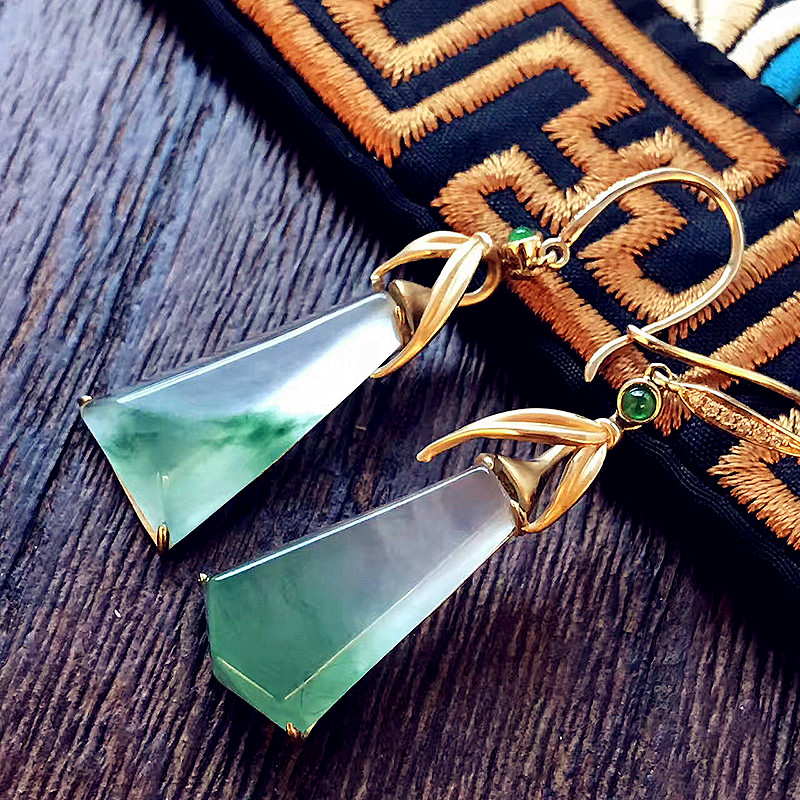 冰飘绿花翡翠设计款耳坠,每一只都有不一样的意境,每只都是一副山水画!两块翡翠料子非常好,冰润通透,冰种飘蓝花很常见,飘绿花却不常见!18k金镶嵌,复古婉约,设计款!喜欢不可错过,世间仅此一件