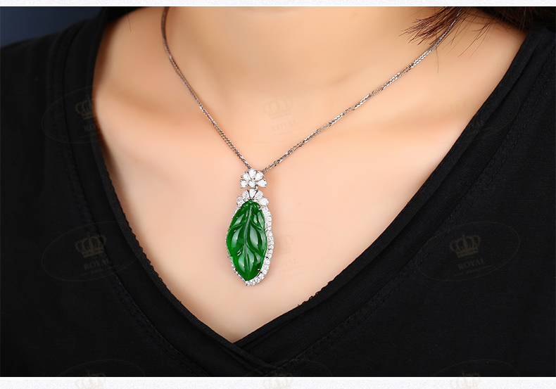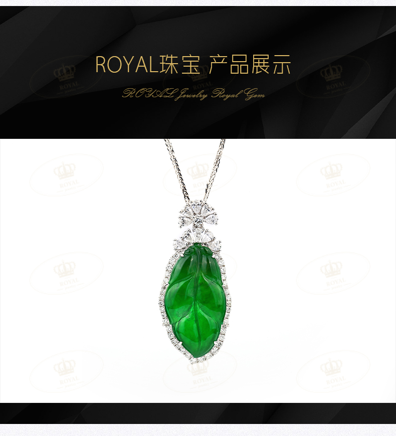 ROYAL JEWELRY翡翠项链缅甸天然A货翡翠树叶吊坠18K金镶嵌高品质收藏代代相传金枝玉叶 事业有成喜欢的小伙伴不要错过哦~~小店还有很多彩色宝石裸石,珍珠裸珠,钻石裸颗。可以定制你喜爱的款式!欢迎到实体店品鉴,试戴,看实物!私人定制,收藏品鉴赏,私信店主V18121271984
