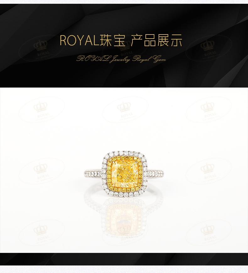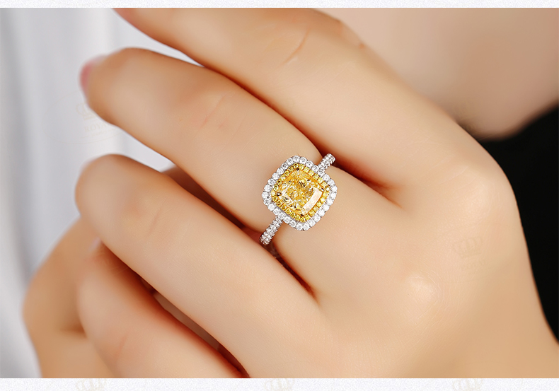 这颗枕形黄钻,做工精美,设计简洁,优雅的身形,优美的演绎高雅,端庄,大气。黄钻非常干净非常闪,副石也是高等!每个女人心中都有很多梦,而钻石是每个女人的共同梦想。如果你已经拥有1颗钻石,这颗黄钻是你的不二之选!彩钻既能保值,又能美丽!1半是美丽,1半是投资!这枚珍品你值得拥有!你值得这么美的钻石戒指!