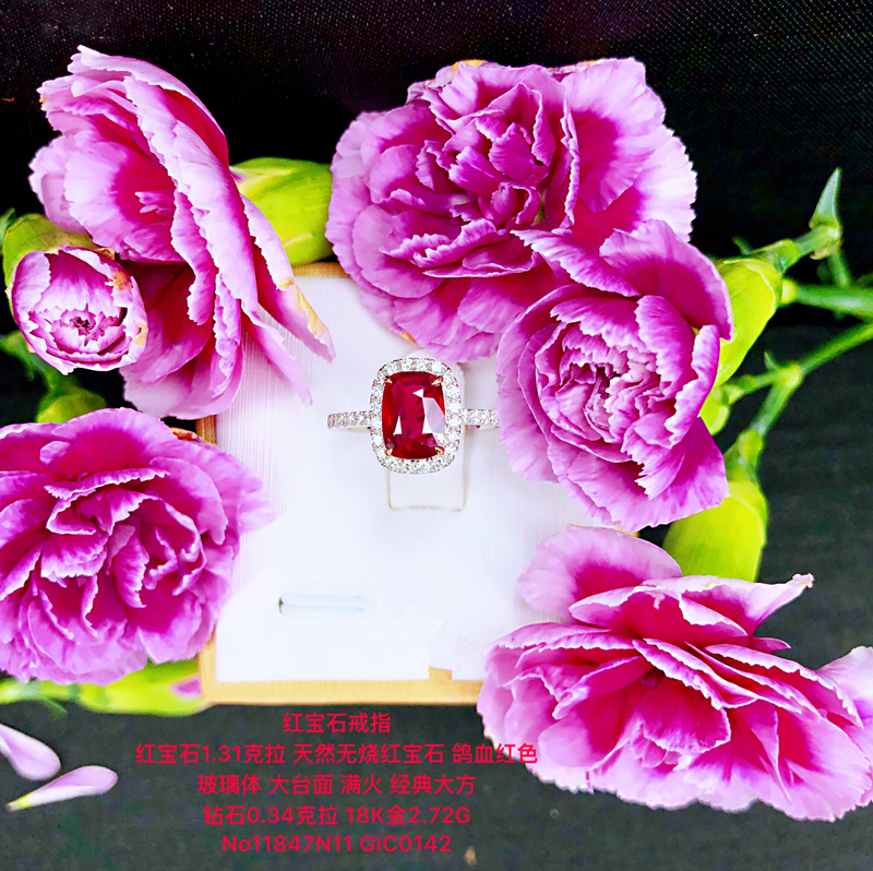 红宝石1.31克拉 天然无烧红宝石 鸽血红色 玻璃体 大台面 满火 经典大方